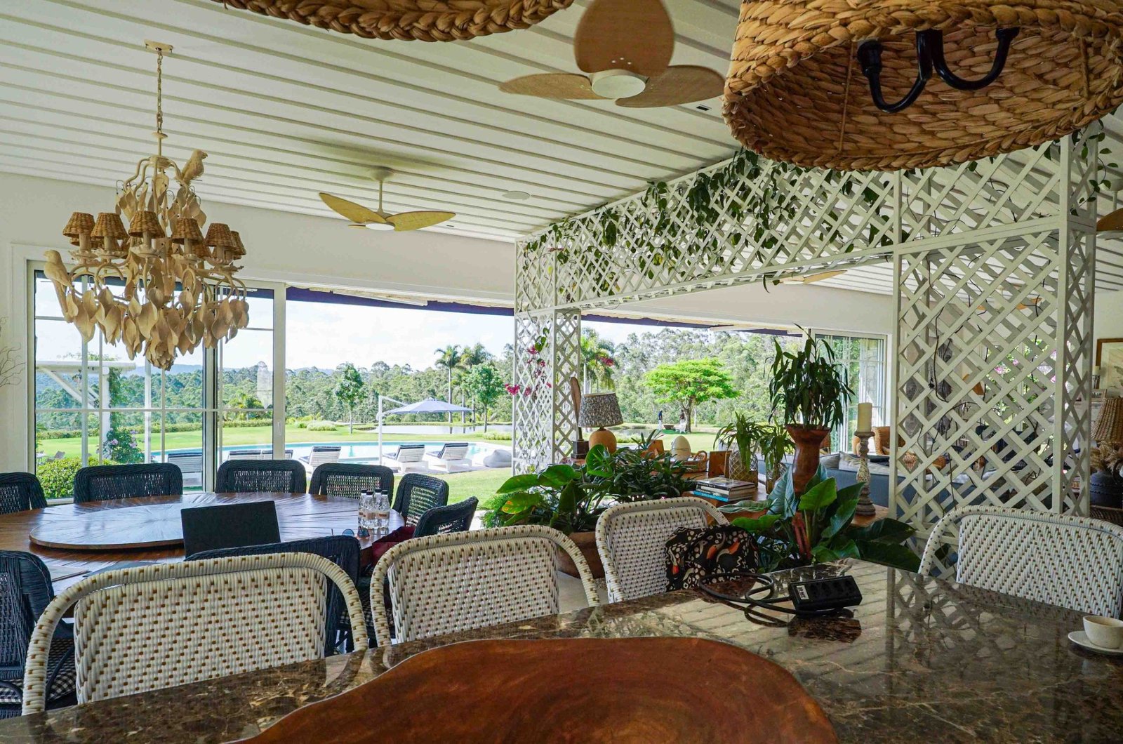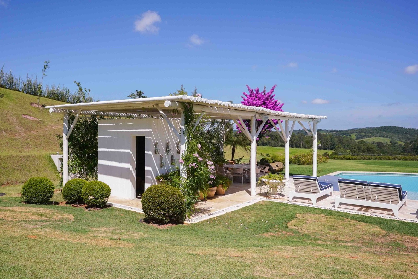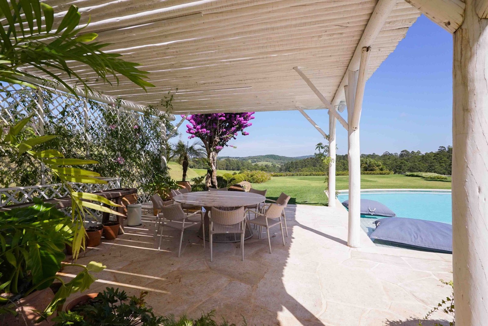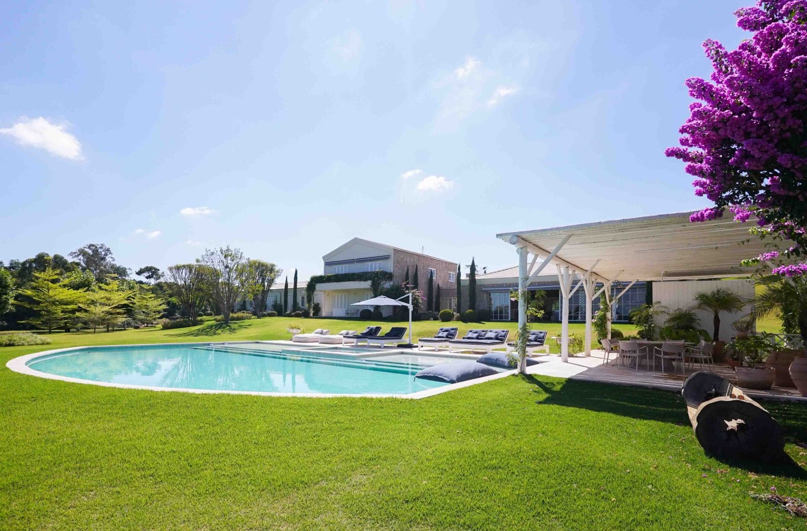 Para além dos interiores, um ponto de destaque é o jardim, que pode ser visto de todos os quartos. Cortado por um riacho sinuoso inspirado no rio Mississipi, o espaço está envolvido por uma vasta área de mata preservada. Características que é replicada no próprio terreno, com espécies trazidas exclusivamente para compor o paisagismo, incluindo uma bougainville centenária.