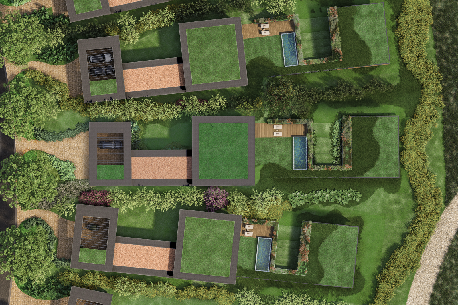 Internamente, os desníveis se refletem em uma setorização fluida dos ambientes. Áreas sociais se abrem para jardins, pátios e espelhos d’água, enquanto os setores mais íntimos se acomodam em níveis mais resguardados, sempre com vistas privilegiadas da paisagem. Caminhos externos, pergolados e áreas verdes costuram os diferentes volumes, transformando a circulação em uma experiência de percurso pela natureza.