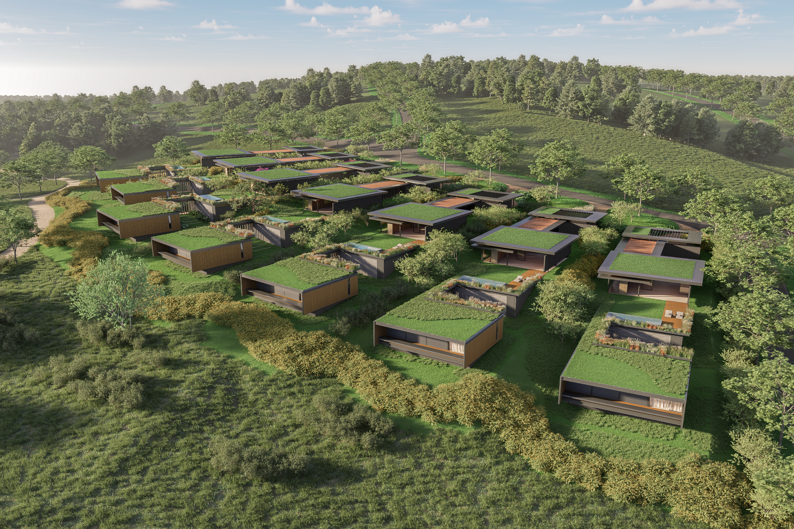 Os telhados verdes têm papel fundamental nessa integração. Além de contribuírem para o conforto térmico e para a retenção de águas pluviais, eles reforçam a leitura da casa como parte do relevo, quase como se os volumes emergissem do próprio terreno. Em alguns pontos, os planos de cobertura se prolongam em grandes beirais, criando áreas sombreadas, varandas e espaços de transição que diluem o limite entre interior e exterior.