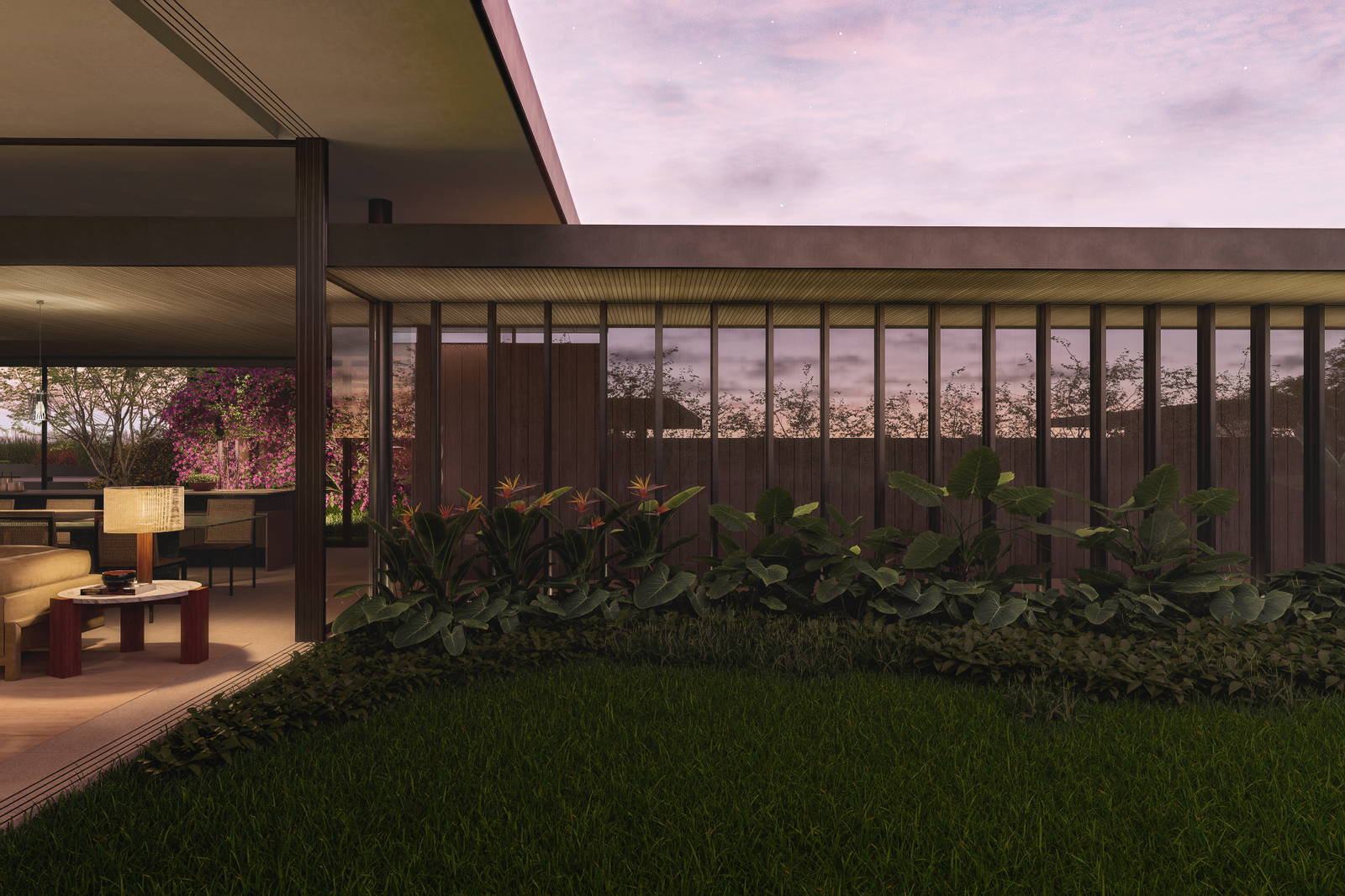 Inserida no contexto do empreendimento Fazenda Vista Verde, a casa dialoga diretamente com a proposta maior de valorização da natureza, do silêncio e da paisagem. Os volumes baixos e alongados se dispersam no terreno como extensões do próprio campo, preservando vistas, respeitando a vegetação existente e garantindo privacidade sem a necessidade de barreiras rígidas. A relação entre construído e natural é constante: jardins, pátios, coberturas verdes e grandes aberturas fazem com que o interior esteja sempre em contato visual e sensorial com o entorno.